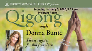 Donna Bunte of Donna Bunte Whole Health will teach a qigong class at Perrot Library on Monday, January 5th, from 9:15 to 10:15 am in the Program Room, Radcliffe Children’s Library.