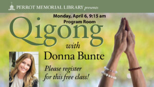 Donna Bunte of Donna Bunte Whole Health will teach a qigong class at Perrot Library on Monday, April 6, from 9:15 to 10:15 am in the Program Room, Radcliffe Building.