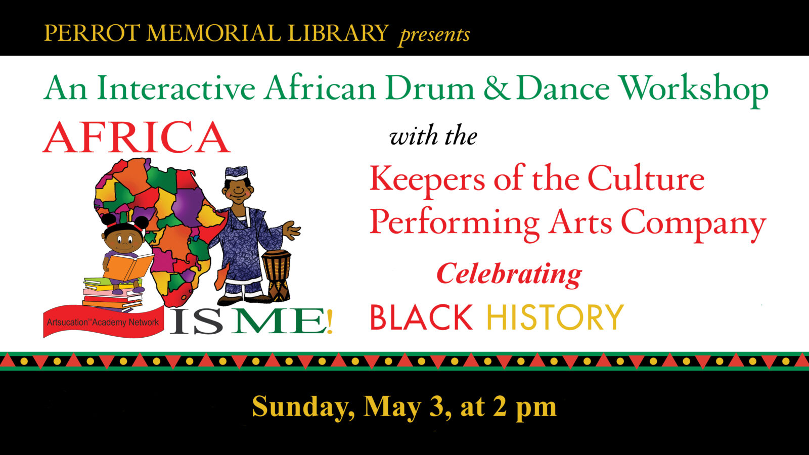 The Perrot Memorial Library is thrilled to present “Africa Is Me! An Interactive African Drum & Dance Workshop,” given by Keepers of the Culture Performing Arts Company. The workshop will take place on Sunday, May 3, from 2-3 pm on the Green (the central carpeted area), Youth Services Department, Radcliffe Children’s Library. Adults and families with school-age children are invited to attend.