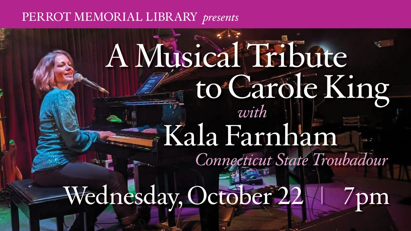 On Wednesday evening, October 22nd, at 7 pm, Perrot Memorial Library will rock with the music of Carole King, performed by Connecticut State Troubadour Kala Farnham. In her “I Feel the Earth Move: The Music of Carole King” concert, Farnham effortlessly weaves through the timeless melodies of Carole King, bringing a unique and soulful interpretation to the iconic singer-songwriter’s repertoire. From chart-topping hits to intimate ballads, “I Feel the Earth Move” is a celebration of King’s influential career, paying homage to King’s groundbreaking contributions to the music industry and capturing the essence of her remarkable journey as the most successful female songwriter of the latter half of the 20th century in the United States.