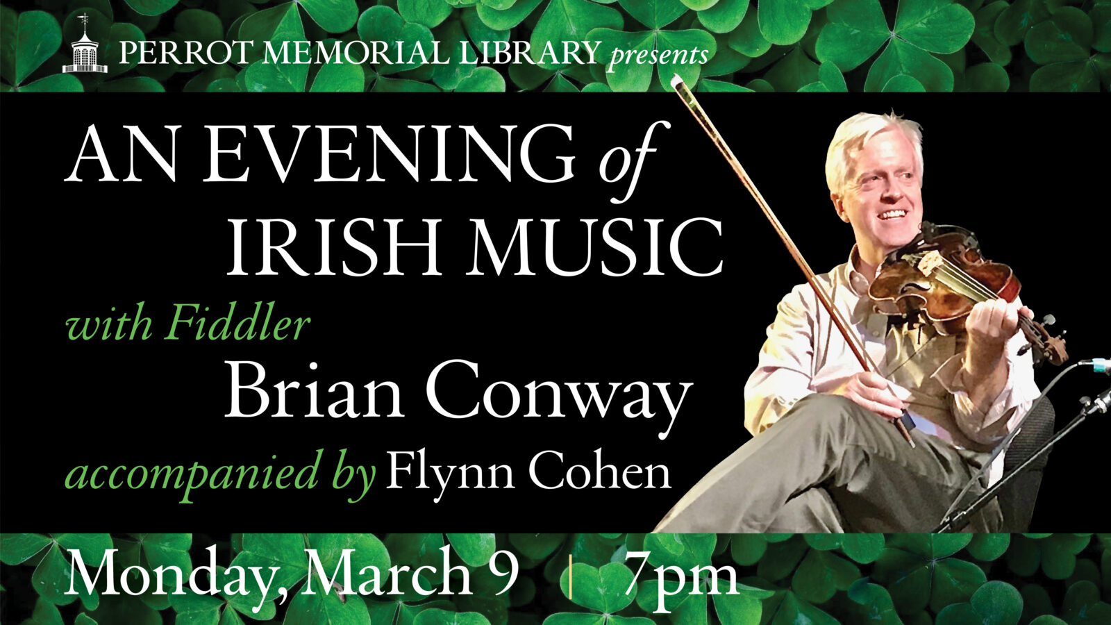 Join us on Monday, March 9, at 7 pm, for “An Evening of Irish Music,” with Irish-American Fiddler Brian Conway, accompanied by Flynn Cohen on guitar. The concert will be given on the “green” (the central carpeted are) in our Youth Services Department, Radcliffe Building, Perrot Memorial Library.
