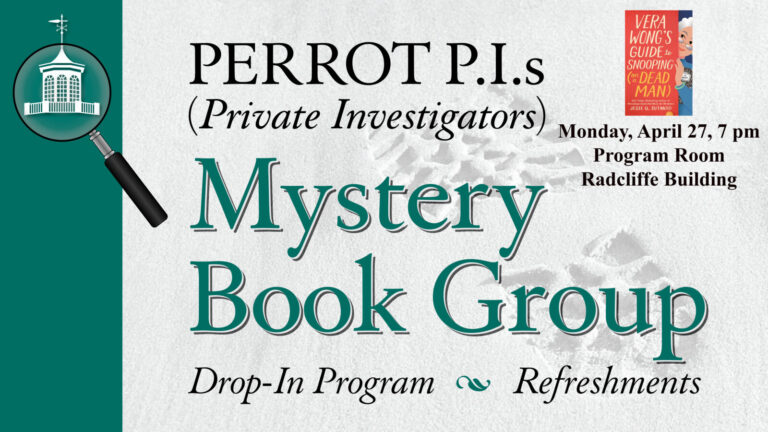 Join our mystery book group discussion of Vera Wong’s Guide to Snooping (on a Dead Man), by Jesse Q. Sutanto, on Monday, April 27, at 7 pm, in our Program Room, Radcliffe Building, Perrot Memorial Library.