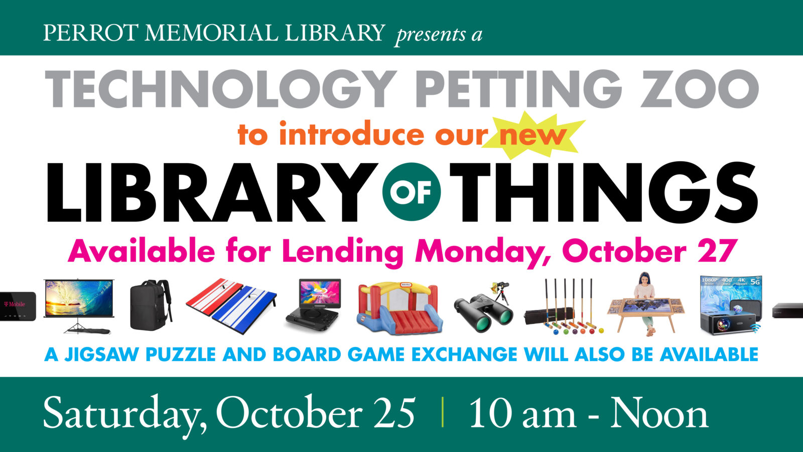 Stop by the Library on Saturday, October 25th, from 10 am to 12 noon, for our Library of Things Technology Petting Zoo! You’ll see all the items we’ve acquired so far and learn about how to check them out for use at home. The Petting Zoo will take place in the basement of the Radcliffe Building (the Children’s Wing). We hope to see you!