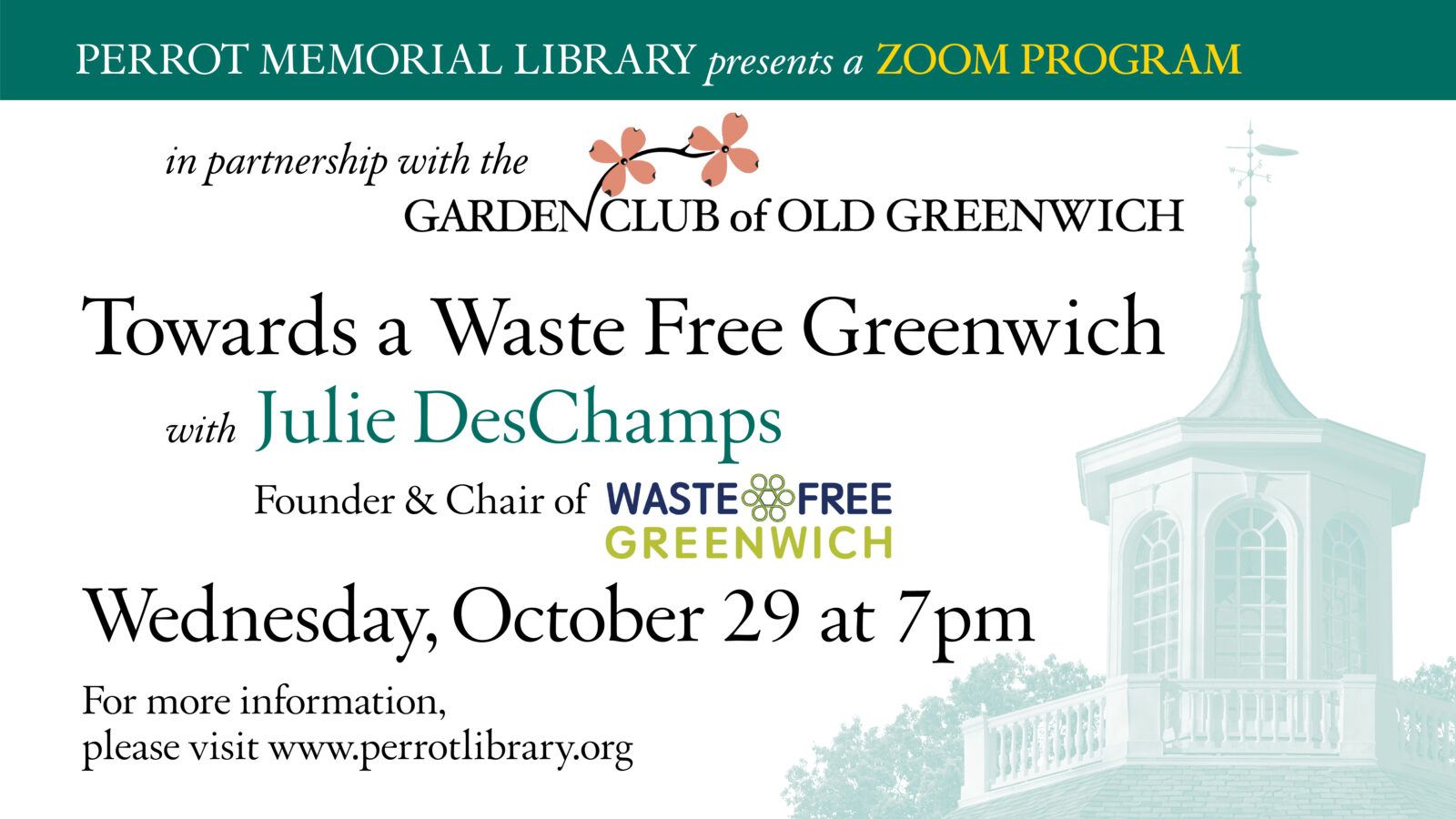 The Garden Club of Old Greenwich and the Perrot Memorial Library invite you to join us for “Towards a Waste Free Greenwich,” a Zoom program with Julie DesChamps, founder and chair of Waste Free Greenwich, on Wednesday, October 29, at 7 pm.