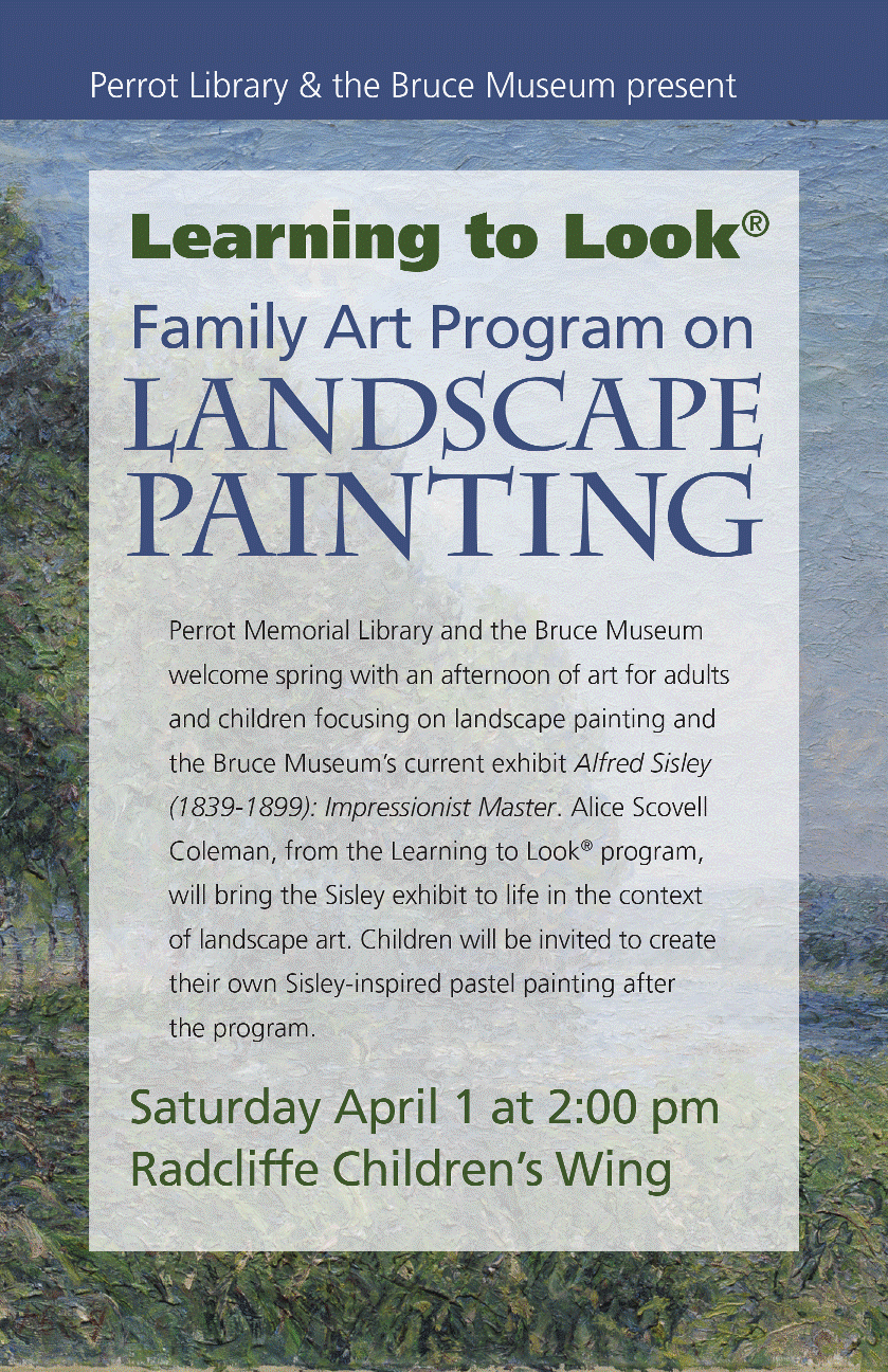 Perrot Library is pleased to welcome back Alice Scovell Coleman, a lecturer with the Learning to Look program, for an afternoon of art. This program will help us welcome spring by focusing on landscape painting and the Bruce Museum’s current exhibit Alfred Sisley (1839-1899): Impressionist Master. Ms. Coleman will bring the Sisley exhibit to life in the context of landscape art. Children will be invited to create their own Sisley-inspired pastel painting after the program.
