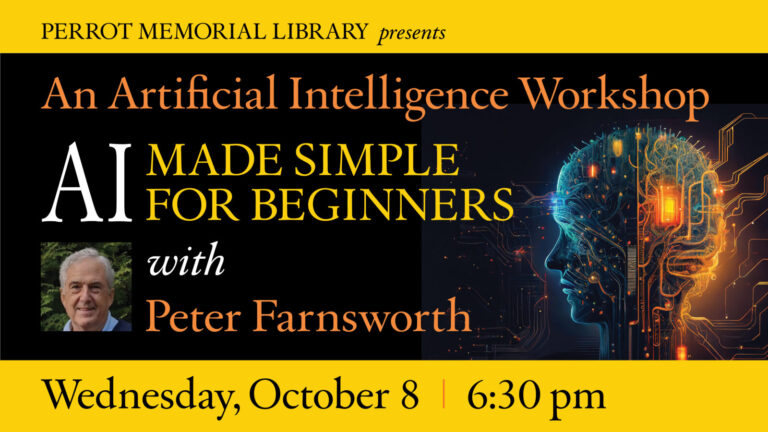 Peter Farnsworth will present “AI Made Simple for Beginners: An Artificial Intelligence Workshop,” on Wednesday, October 8, at 6:30 pm in our Program Room, Perrot Memorial Library.